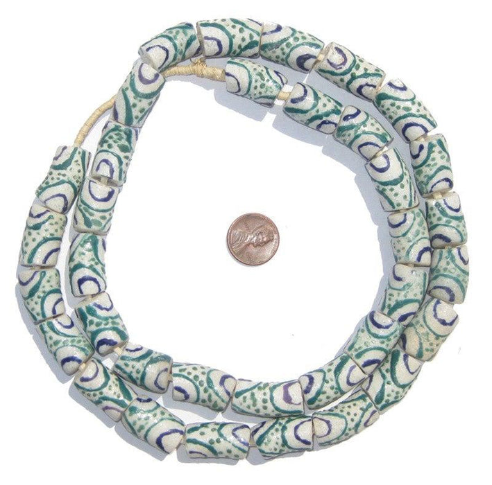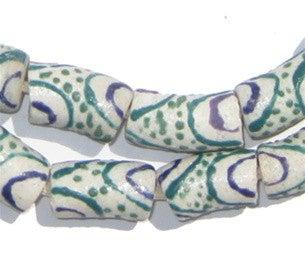 A beautiful strand of powder glass African beads, made by the people of Krobo Mountain ( Ghana , West Africa ) ,reproducing old Venetian FANCY trade beads. Made from bottles and other glass items that are turned into powder, then poured into molds in order to create this nice looking drum shaped beads. Decorations on the beads are made with a paste made of colored glass powder and water, which is applied using a thin wooden stalk. They are cooked a second time to fix the decor. The beads are handmade. This strand is especially long, giving you more beads for your money.