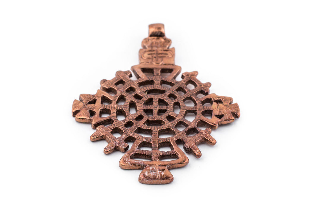 This traditional cross was hand-casted in a time-honored Ethiopian design. Cross pendants and processional crosses have long graced Ethiopian rituals and customs, and have become icons of Ethiopian culture. This African cross is of exceptional quality. Measuring approximately 65 x 50mm, this cross has a hole size of 3mm. Available in brass, silver, and copper finishes. Incorporate into your jewelry designs, or simply throw on a leather cord to wear as is! This artisan product is made using premium copper electroplating over brass to make these copper finish customer favorites.