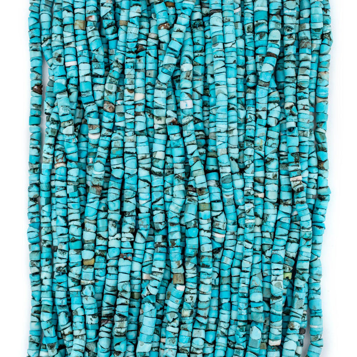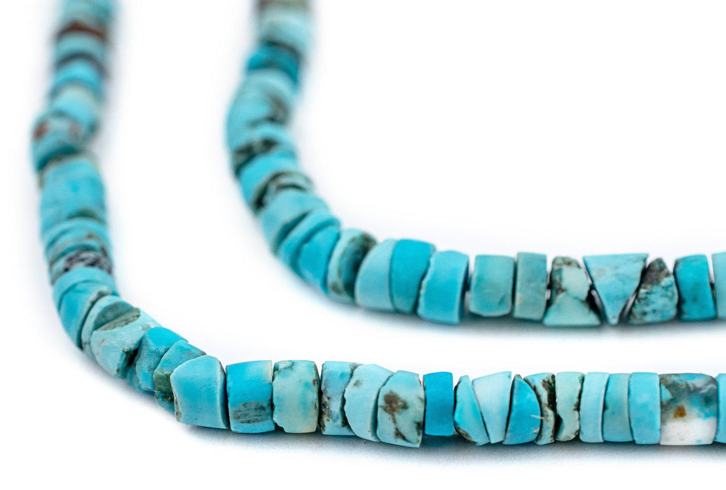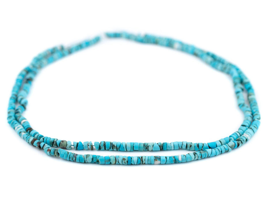 These unusual turquoise beads have a delightfully rustic feel to them. The slightly irregular shapes, sizes, and colors lend an almost ancient feel to the matte stone finish. Fashioned in Afghanistan, each strand measures approximately 15" long with individual beads 2-3mm wide and 4mm in diameter. A unique find to add to your beading collection!