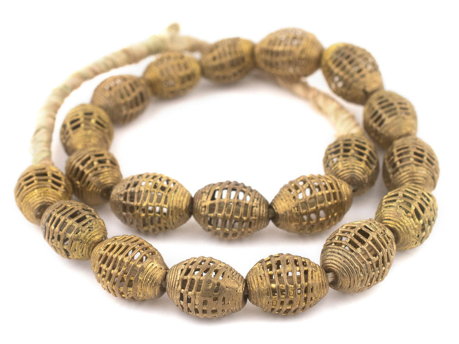 Take a look at these basket design Ghana Brass Trade Beads from Africa. Each bead is made individually through the "Lost Wax process" technique. This strand is about 25", with beads measuring approximately 21-25 x 15-18mm. Each strand may have 1-2 beads that are less than perfect and may vary slightly from strand pictured.