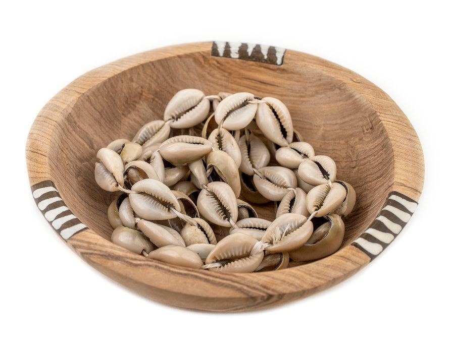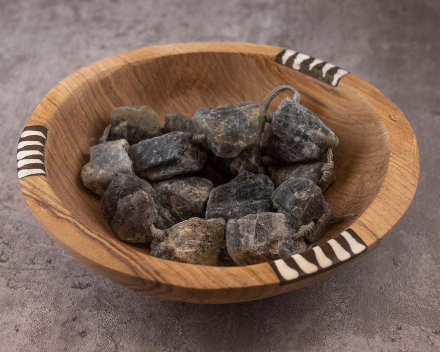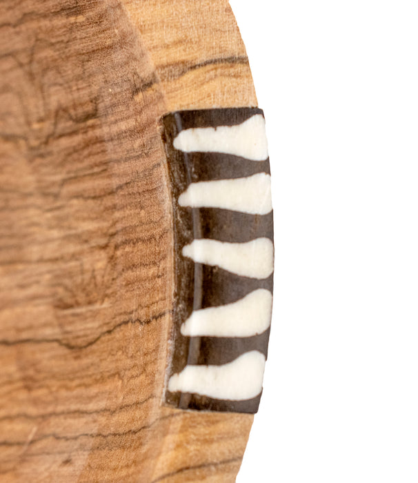Hand-crafted in Kenya, this beautiful carved wooden bowl is inlaid with batik bone. The custom-made bone pieces are dyed in a traditional East African design, then set inside the wood. Available in a variety of sizes, these bowls work great as decorative pieces and can be placed on coffee table, dining table, or bookshelf. Drape a strand of our much loved batik bone beads inside for a perfectly balanced centerpiece! This bowl measures approximately 5-7 x 2 inches. If you prefer the wood grain to be more vibrant, lightly apply some mineral oil with a sponge and you'll see the colors come to life!