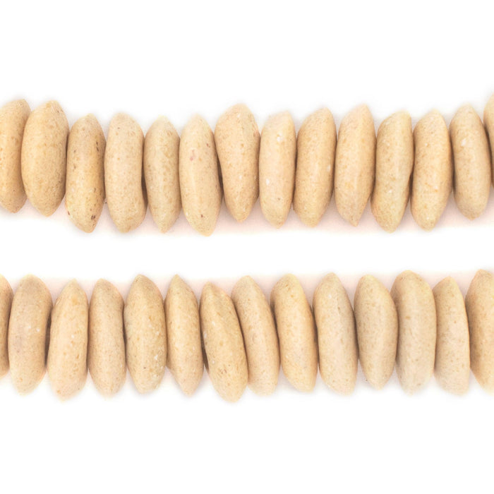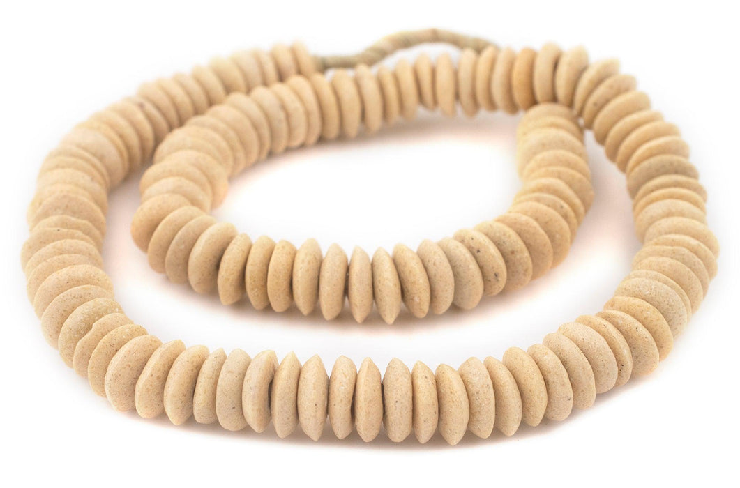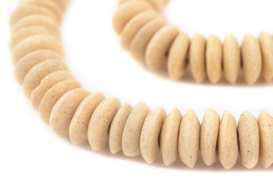 Checkout this beautiful strand of Ashanti glass saucer beads. The process of making these beads is unique to Africa and has been used for over 1000 years. Pulverized glass of various colors is poured into a clay mold, using a cassava stem for the bead's hole. The mold is placed in a furnace and heated until the glass particles congeal without actually melting and the stem burns out. The Ghanaians have been making beads in this manner since the 1600s. Each bead measures approximately 4 x 14mm with a hole size of approximately 2-3mm. You will receive a full strand measuring approximately 24".