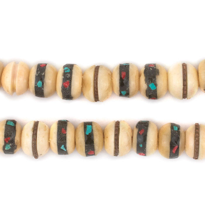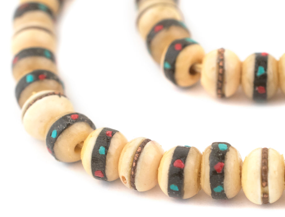 Take a look at this amazing strand of handmade prayer beads made from natural color yak bone. Each unique bead has been inlaid with brass, turquoise or coral color bits. The strand is approximately 34" long, and the beads measure about 7-8 x 10mm. Tone of bone may vary slightly from strand to strand. Another great strand of beads to add to your collection!