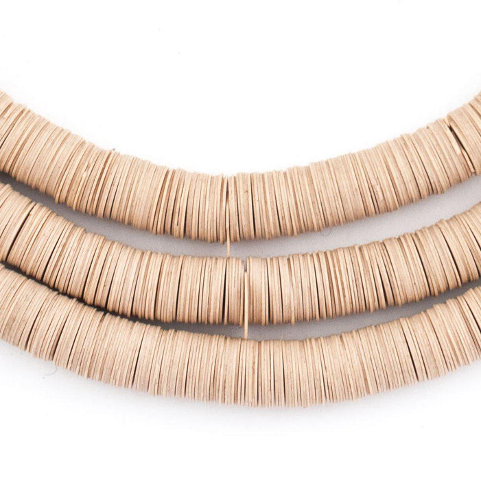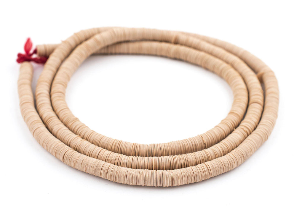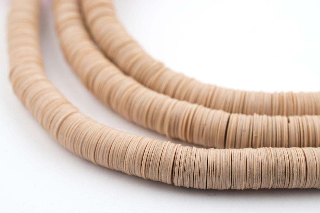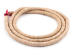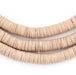 Take a look at this beautiful strand of African vinyl beads in an unusual beige color. Beads such as these are found in Ghana and Nigeria where they are sometimes worn as waist beads. Older versions of vinyl beads were said to be made from recycled phonograph records. This strand measures approximately 35" long with individual beads measuring 1mm wide by 6mm diameter. These beads are light, fun to wear, and also versatile for jewelry designs. Each strand is sold individually.