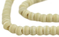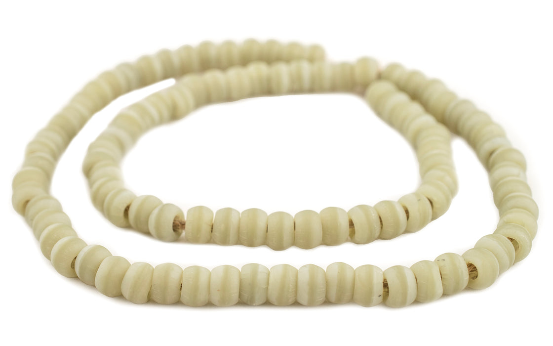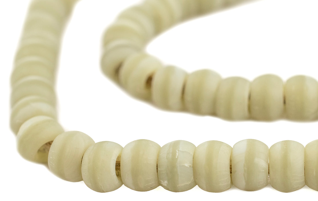 Explore the understated elegance of our Beige Yellow Padre Beads. Crafted with care from glass, these beads showcase a serene palette of pale sand and beige-like yellow. Each bead is accented by a subtle darker beige stripe down its center, adding depth and character to its round shape. The rustic and boho-inspired look of these beads is further enhanced by interesting cracks that meander through some of the beads, giving them a unique personality and an authentic artisanal feel. Each bead measures approximately 6 x 9mm with a hole size of roughly 3-4mm. You will receive one full strand measuring about 24" in length. Add these useful glass beads to your design toolkit today.