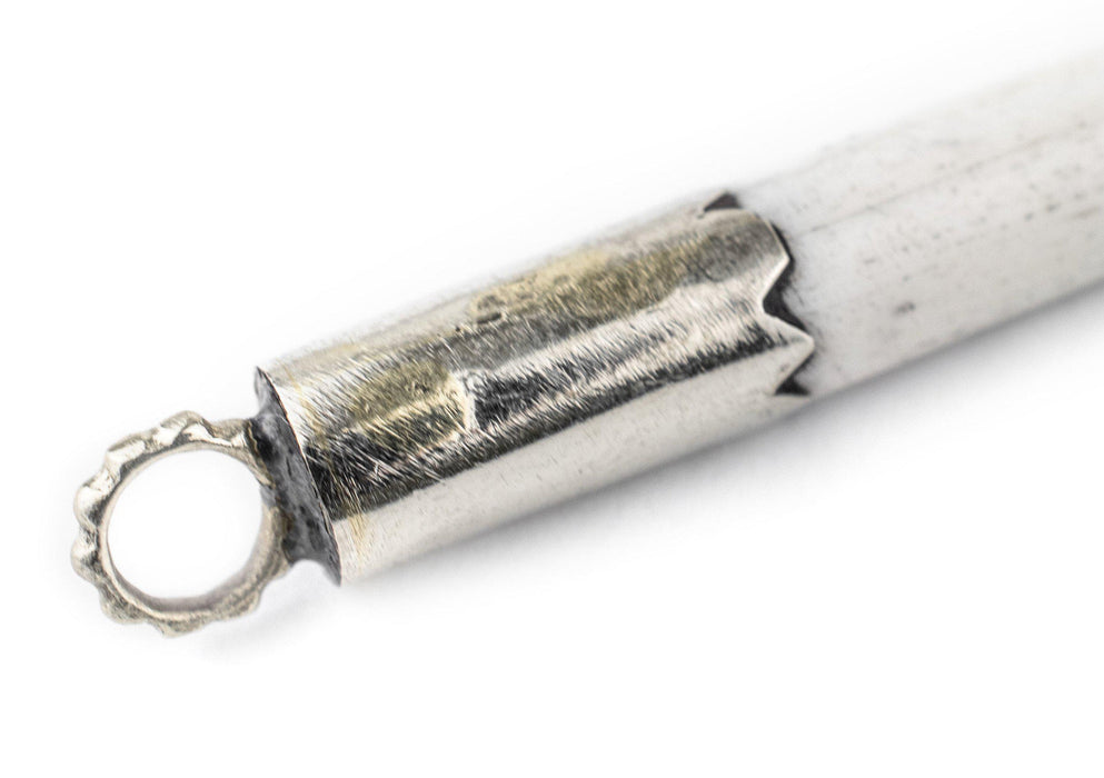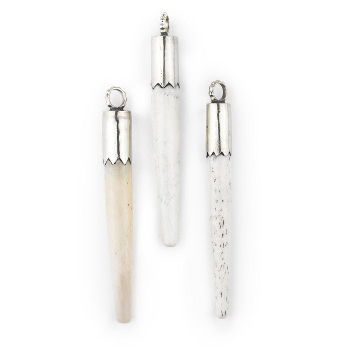 Unique bone pendant in shape of tiger tooth with silver bezel. Each pendant is unique and may show slight variation from picture.