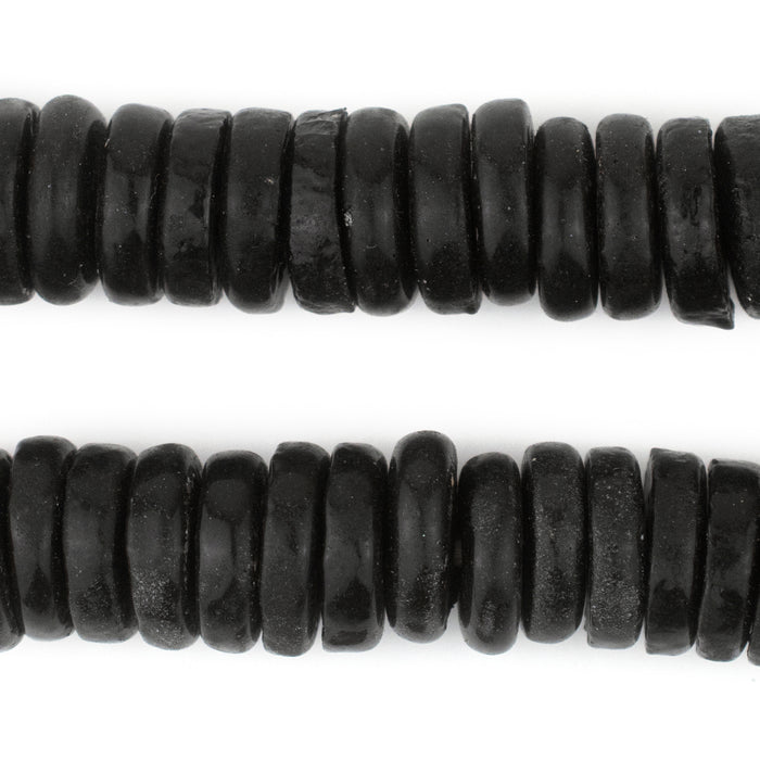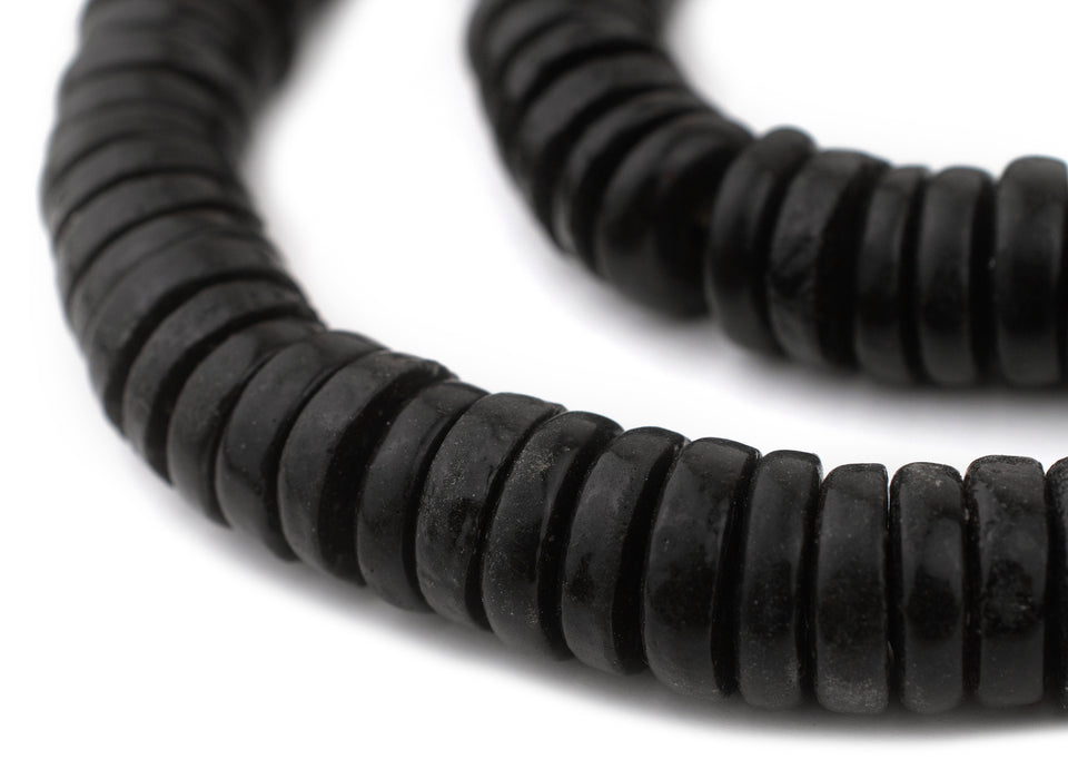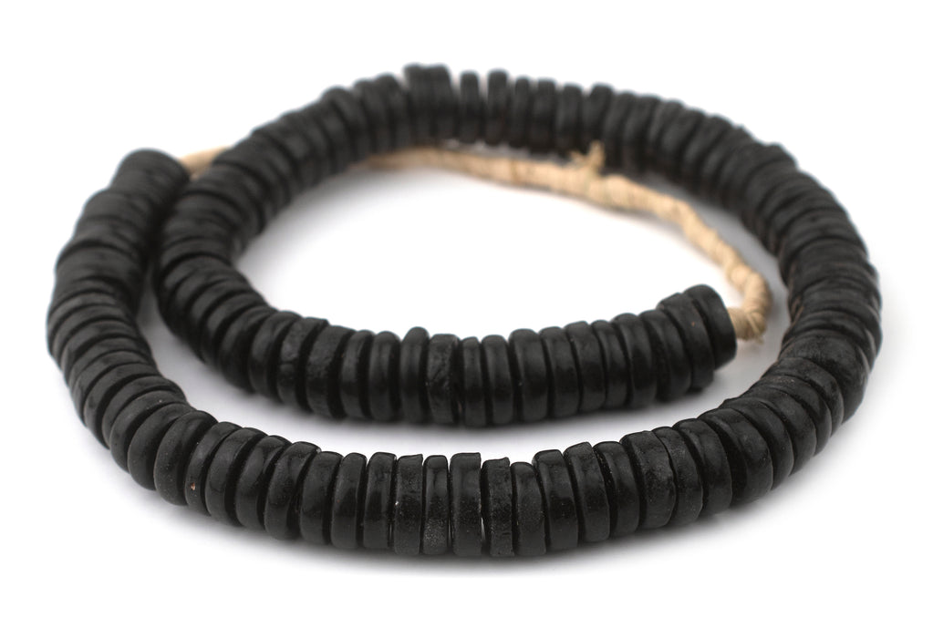 Checkout this beautiful strand of Ashanti glass saucer beads. The process of making these beads is unique to Africa and has been used for over 1000 years. Pulverized glass of various colors is poured into a clay mold, using a cassava stem for the bead's hole. The mold is placed in a furnace and heated until the glass particles congeal without actually melting and the stem burns out. The Ghanaians have been making beads in this manner since the 1600s. Each bead measures approximately 6 x 17-18mm with a hole size of approximately 3-4mm. You will receive a full strand measuring approximately 28".