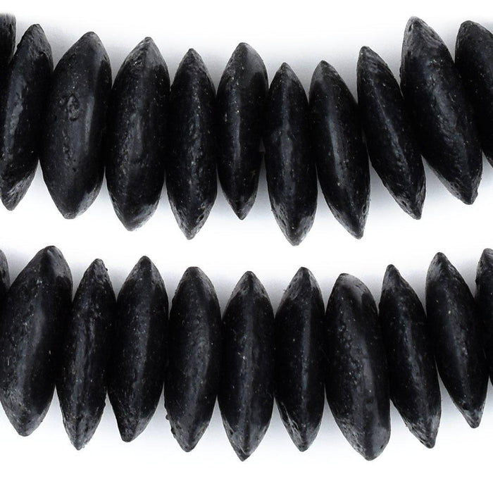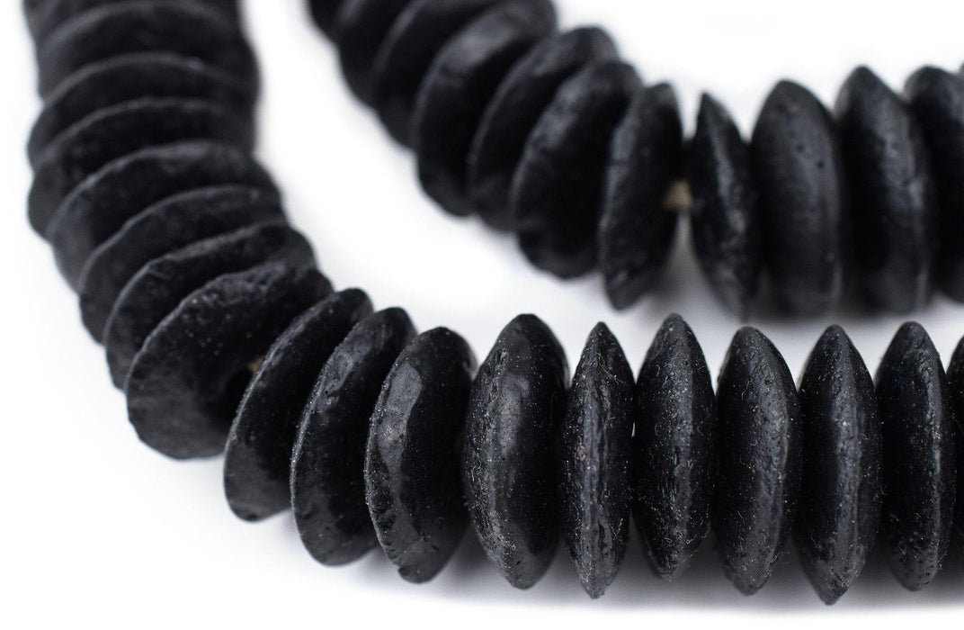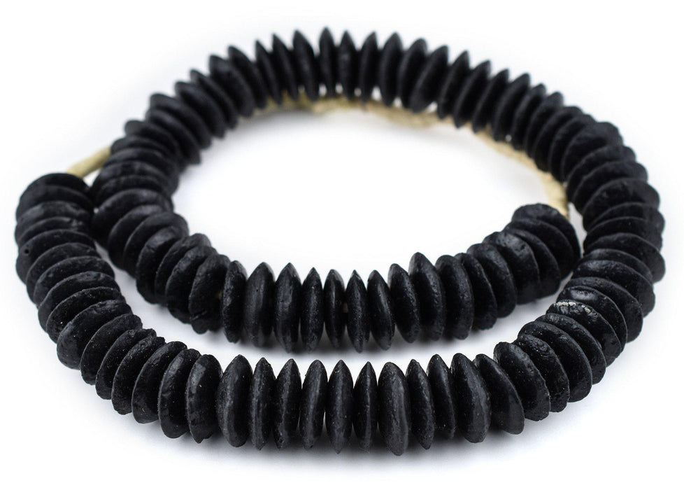 Checkout this beautiful strand of black color Ashanti glass saucer beads. The process of making these beads is unique to Africa and has been used for over 1000 years. Pulverized glass of various colors is poured into a clay mold, using a cassava stem for the bead's hole. The mold is placed in a furnace and heated until the glass particles congeal without actually melting and the stem burns out. The Ghanaians have been making beads in this manner since the 1600s. Each bead measures approximately 5-7 x 20-23mm. Get yours today!