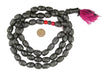 Prized throughout the islamic world, black coral prayer beads have a long and storied heritage. Black coral beads are said to be made from a rare form of coral found in the seas of the Arabian Peninsula. Craftsmen from Yemen are known to have made these special beads, decorating them with intricate inlaid patterns of silver and other metals. This strand has been adorned with a traditional motif that includes the eye design intended to protect the holder from bad luck. The inlaid metal designs have been individually placed by hand. Beads such as this have been traded widely especially throughout the lands of the former Ottoman Empire and have been found in such far off places as Morocco and even West Africa.