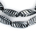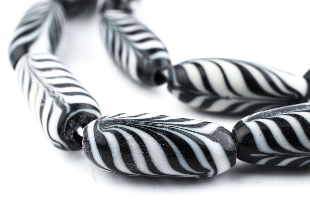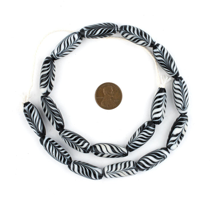 Take a look at this great strand of elongated black feather beads. Beads such as this were traded widely by Europeans and were prized for their workmanship. The feather motif is an ancient pattern identified in beads from as far back as antiquity. Each strand measures approximately 22 inches long, with beads measuring 25-28mm in length and 10-11mm in diameter. These beads are handmade so there is some minor variation in color from strand to strand.