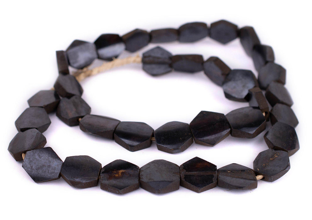 These black bone beads are a traditional craft of Kenya. Each bead has been has been cut and polished by hand. Kenya bone beads are most frequently found in round and smooth shapes so these flat hexagonal beads are an innovative variant! Each bead measures approximately 20-21 x 19-21mm with a hole size of 2mm and a strand length of 30". The beads has been strung on natural raffia straw.