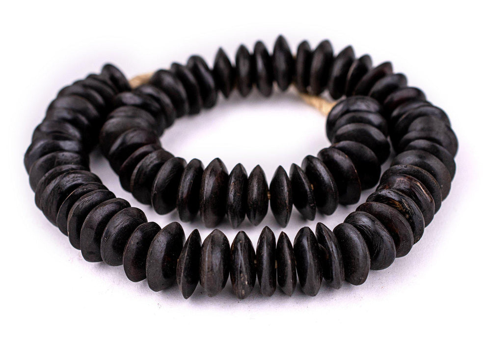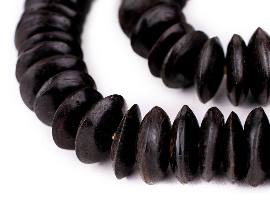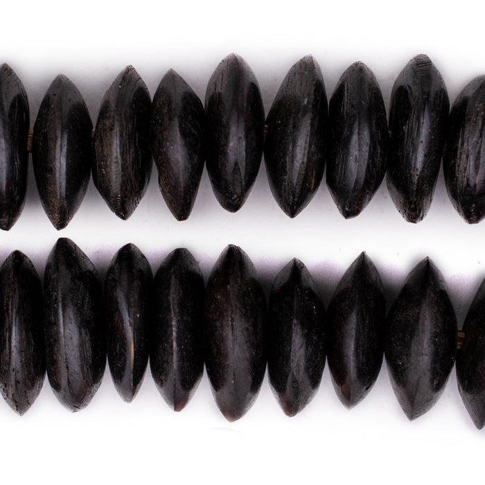 These beads measure approximately 6-7 x 17-20mm, with a hole size of 2mm. Strands measure approximately 24", and have approximately 70 beads each. The color is a brownish-black and may have some brown hues.