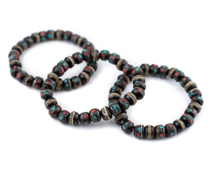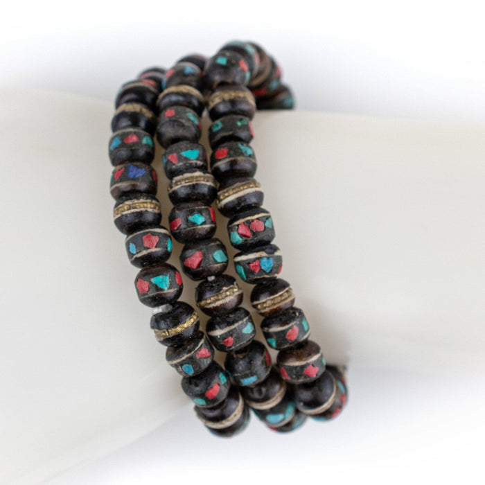 Malas are traditionally used in Buddhist culture as a part of the practice of meditation, however, today malas are enjoyed by people around the world looking to gain mental clarity and live in the present. Our collection of mala bracelets are handmade in Nepal using traditional inlaid beads. These beads are hand carved, inlaid with coral and turquoise style pieces, and strung 27 beads per 7.5 inch bracelet. Available in over 15 colors, choose your favorites to build your own unique stack! Beads may also be repurposed into your own unique jewelry designs. Multiple bracelets may be pictured, however each bracelet is sold individually.
