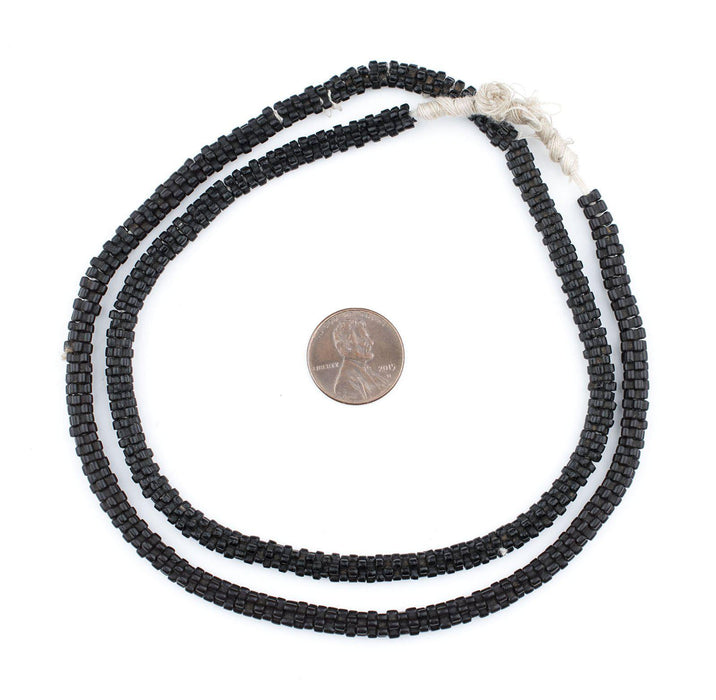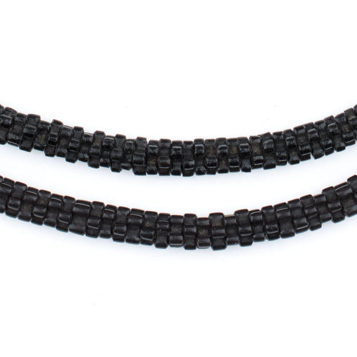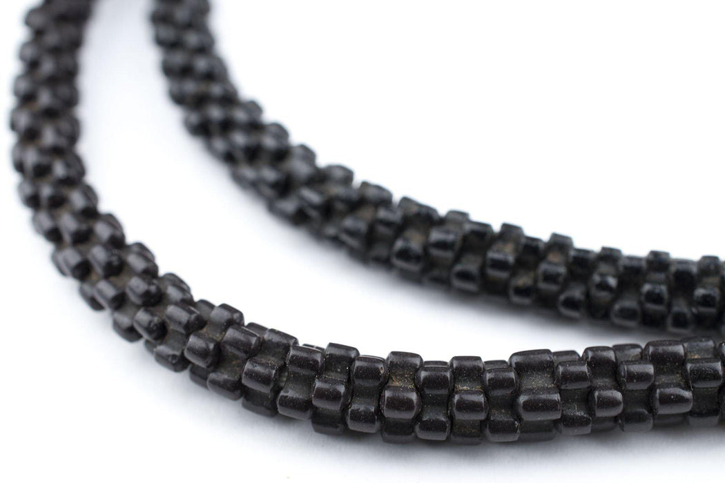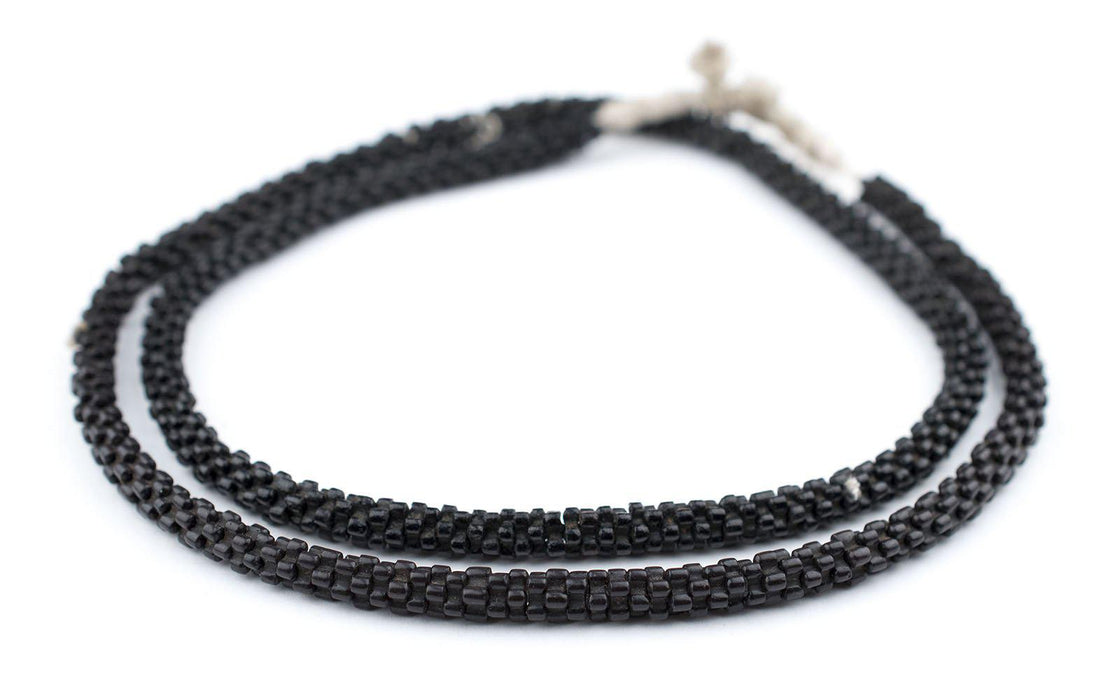 This strand of interlocking Czech glass beads is called "SNAKE" trade beads because of its similarity to the snake vertebrae. They date back from the early 1900's. These beads have been molded and the strand is in pretty good condition. This is a black color strand and is great to be used as spacers. The beads measure approximately 2 x 5-6mm, and tones may vary slightly with a few beads of other colors possibly interspersed. This 'star' variety of snake beads is rare and much more difficult to find.