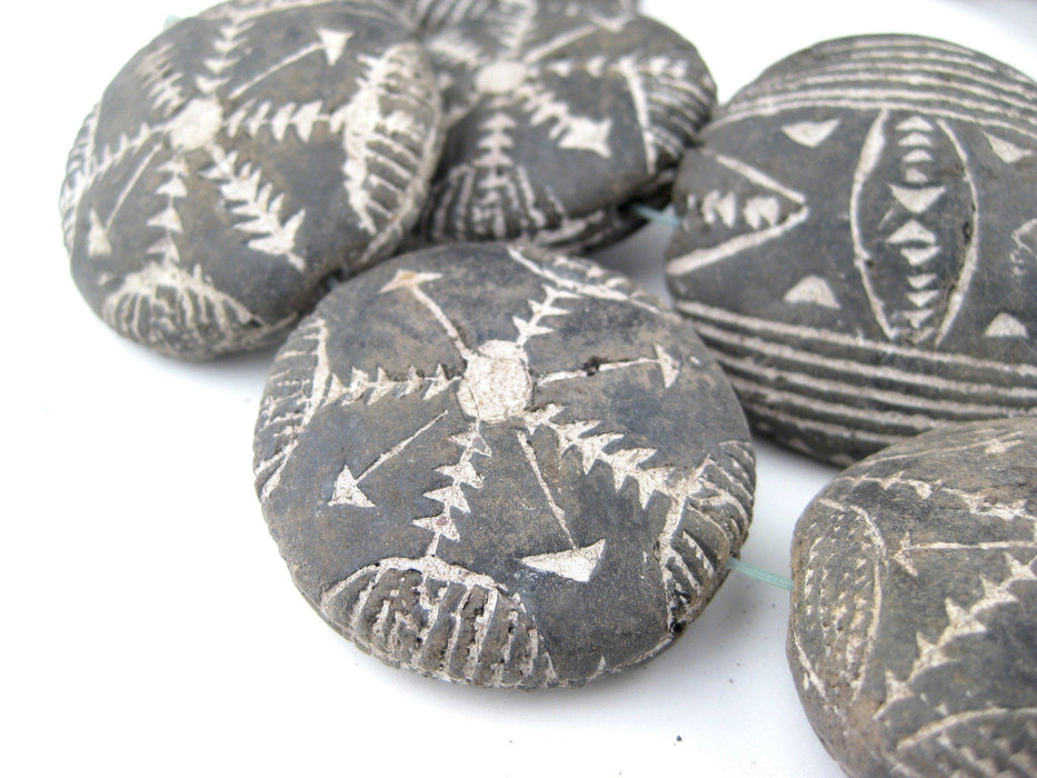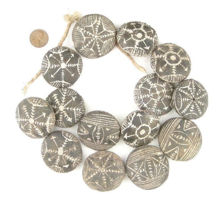 This beautiful strand of Mali Medallion terracotta beads is made with clay and each bead is individually inscribed with traditional motifs. It is made by the Dogon tribe of Mali. Each strand may show slightly different designs. Beads measure approximately 42mm across.