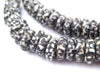 This uniquely patterned strand of rondelle beads is made using traditional methods used to create powder glass beads. The procedure for making the beads consists of a number of steps whereby powdered glass is poured into molds of clay and baked in a specialized oven. Individual beads measure 4 x 11mm and have a hole size of approximately 2mm.
