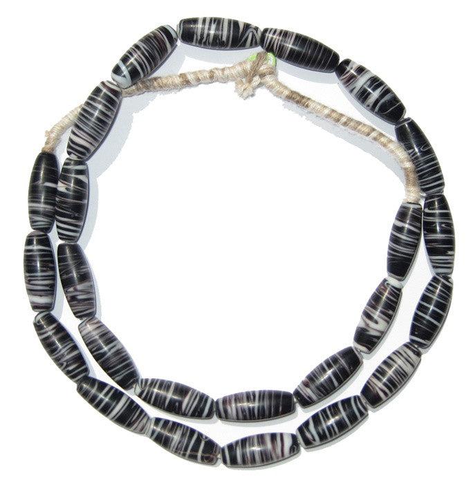Although the origin of these beads is known, they do come from Africa. They are made through a process of winding the black and white beads over a mantel and gives a feeling of twirl. These beads are handmade individually and have a diameter of approximately 10 mm. They are about 25 26 mm long each. Description