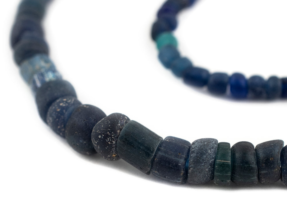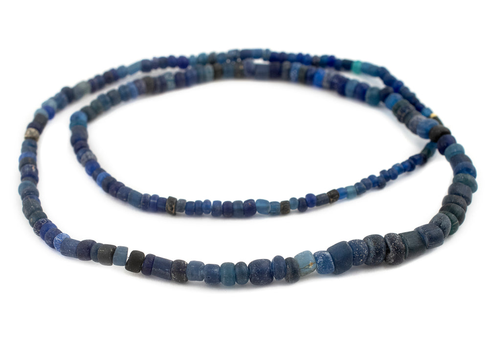 These authentic Djenne beads derive their name from the ancient city in Mali where they are found. Also known locally as Nila beads, they are said to be made of ancient excavated glass and are centuries old. The exact provenance of these beads is not known but it is believed that they may be possibly roman. Djenne beads are a more rare variety of African bead and are found in several colors including white, black, yellow, green, and blue. Blue beads such as these are more highly coveted and harder to find. Each bead measures approximately 3-8 x 2-8mm. You will receive the exact strand pictured.