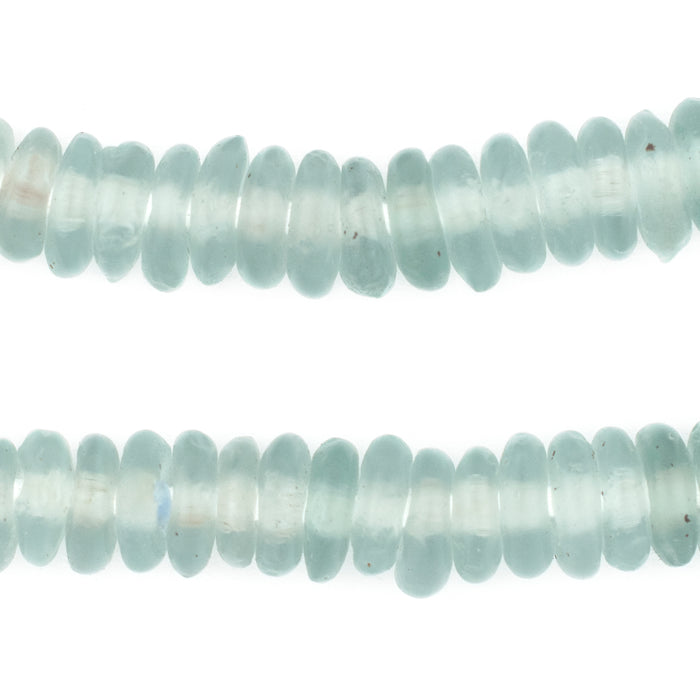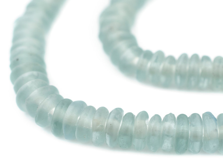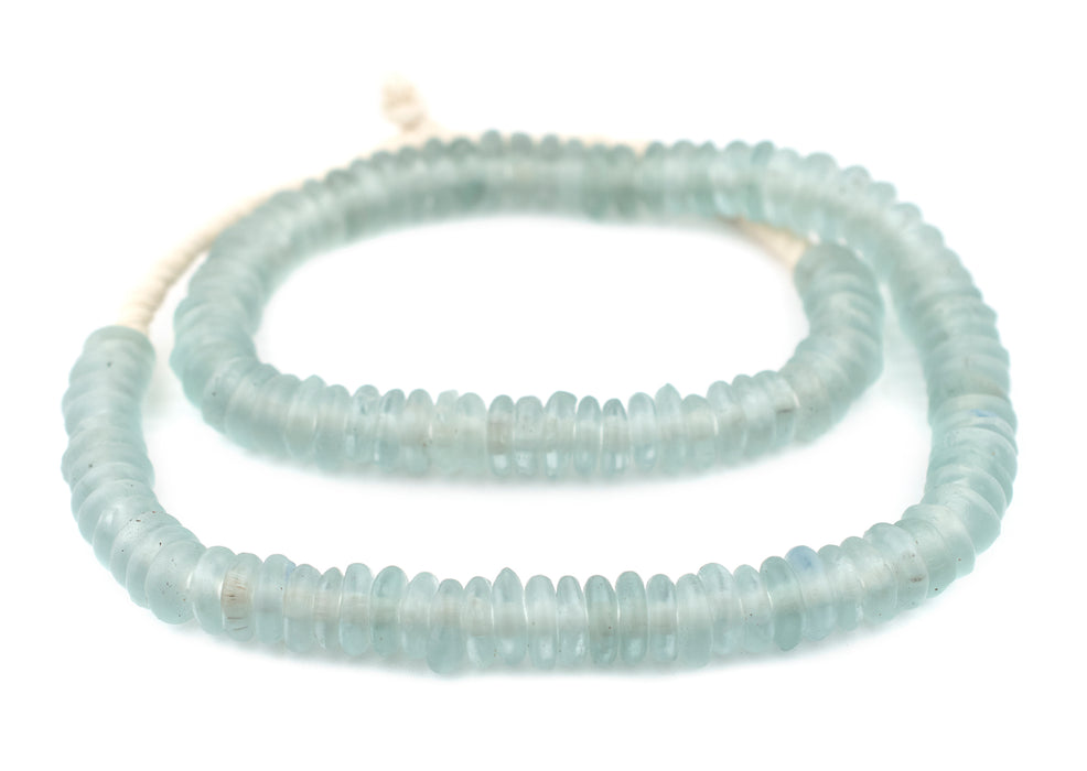 Take a look at these beautiful rondelle-shaped recycled glass beads. Powder glass beads are made by crushing glass to a fine powder and heating it so that the particles fuse together. The glass is then poured into clay molds, with a cassava leaf stem used to make the hole. They are baked in an oven and the glass fuses and the cassava stem burns up. This technique has been used in Africa for centuries. Each bead measures approximately 3-4 x 11-12mm with a hole size of approximately 2mm. You will receive a full strand measuring approximately 25".