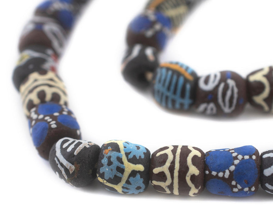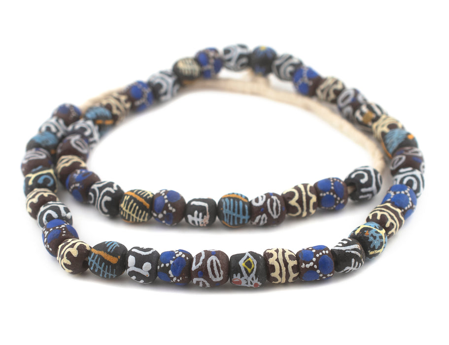 This beautiful strand of African powder glass beads was made by the people of Krobo Mountain in Ghana, West Africa. Many designs of Krobo beads are patterned to resemble old Venetian fancy trade beads. They are made from bottles and other glass items that are turned into powder, then poured into molds in order to create beads. Decorations on the beads are made with a paste made of colored glass powder and water which is applied by hand using a thin wooden stalk. The beads are cooked a second time to fix the decor. Each bead measures approximately 11-12 x 12-13mm with a hole size of approximately 2-3mm. You will receive a full strand measuring approximately 28".