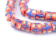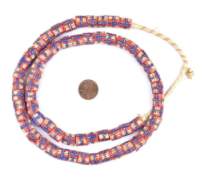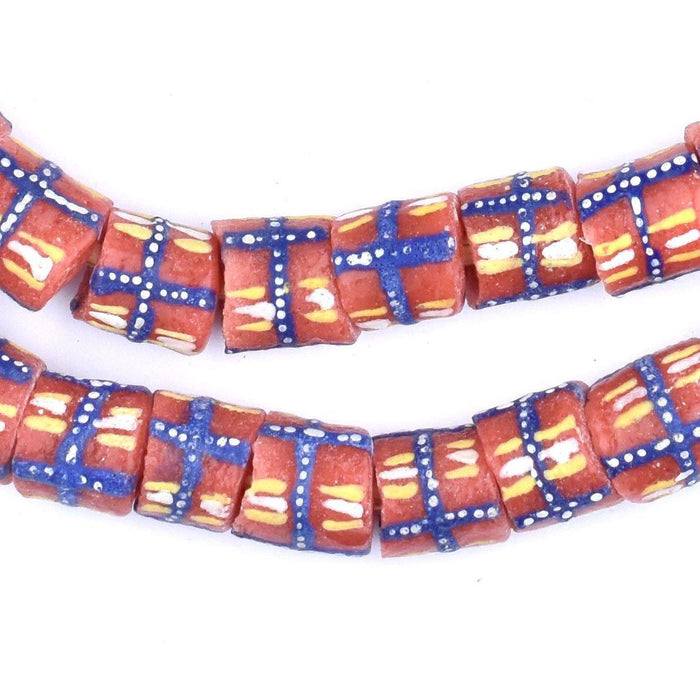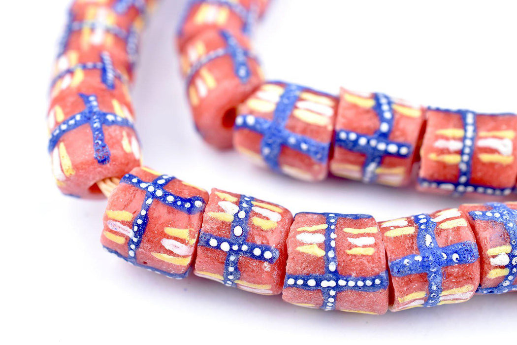 A beautiful strand of powder glass African beads, made by the people of Krobo Mountain in Ghana, West Africa. Many designs of Krobo beads are patterned to resemble old Venetian FANCY trade beads. Made from bottles and other glass items that are turned into powder, then poured into molds in order to create these cylinder shaped beads. Decorations on the beads are made with a paste made of colored glass powder and water which is applied by hand using a thin wooden stalk. The beads are cooked a second time to fix the decor. Each bead is unique and will measure approximately 11-25 x 11-12mm. Strand may vary slightly from picture.