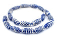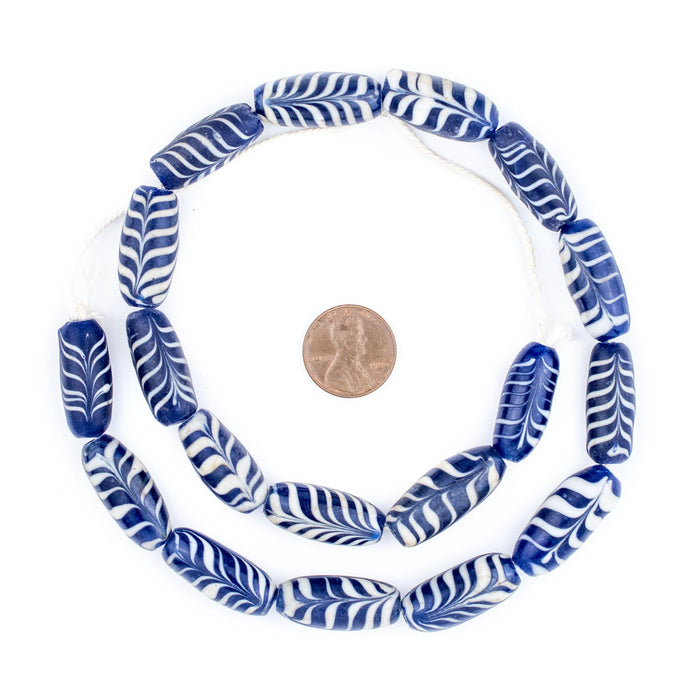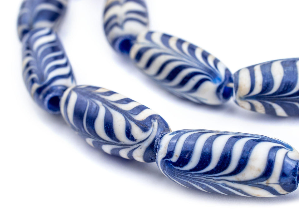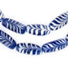 Take a look at this great strand of elongated blue feather beads. Beads such as this were traded widely by Europeans and were prized for their workmanship. The feather motif is an ancient pattern identified in beads from as far back as antiquity. Each strand measures approximately 22 inches long, with beads measuring 25-28mm in length and 10-11mm in diameter. These beads are handmade so there is some minor variation in shape, size, and color from bead to bead. Beads are matte finish.