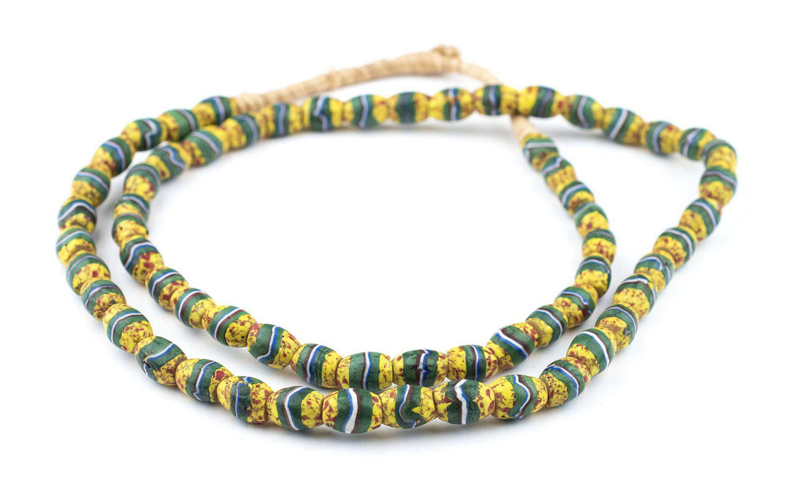 Admire this beautiful strand of antique Venetian trade beads! Venetian glass beads such as these were made throughout the 19th and 20th century primarily for export to Africa. Today they are found in many countries including Ivory Coast, Nigeria, and Ghana where they are also known by their Ashanti name “Chachasao”. Most beads are commonly cylindrical in shape but other varieties exist including rectangular, oval, and sometimes even hexagonal beads.