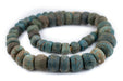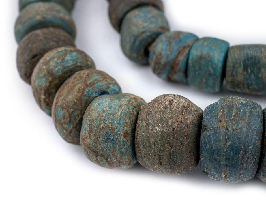 Take a look at these amazing Turquoise color Hebron beads. Sometimes also referred to as "Kano Beads". They are said to have been made in Hebron circa 1800 if not earlier and traded southward into the African continent. Each strand measures approximately 26-28" including raffia with individual beads measuring from 18-16mm wide and 12-25mm in diameter. This unusual turquoise blue color is more rare. Several beads on each strand may show more chipping than others. Bead count may vary and is intended to be approximate. Please let us know if you require to see the exact strand you will receive in advance. You will receive a strand very similar to the strand pictured. A small quantity of mineral oil has been applied to these beads to enhance the color. If you prefer a more weathered look, we also have a second profile for turquoise Hebron beads that you can see here: https://www.thebeadchest.com/products/antique-turquoise-hebron-kano-beads-natural . Limited number of strands are available for these unusual beads.