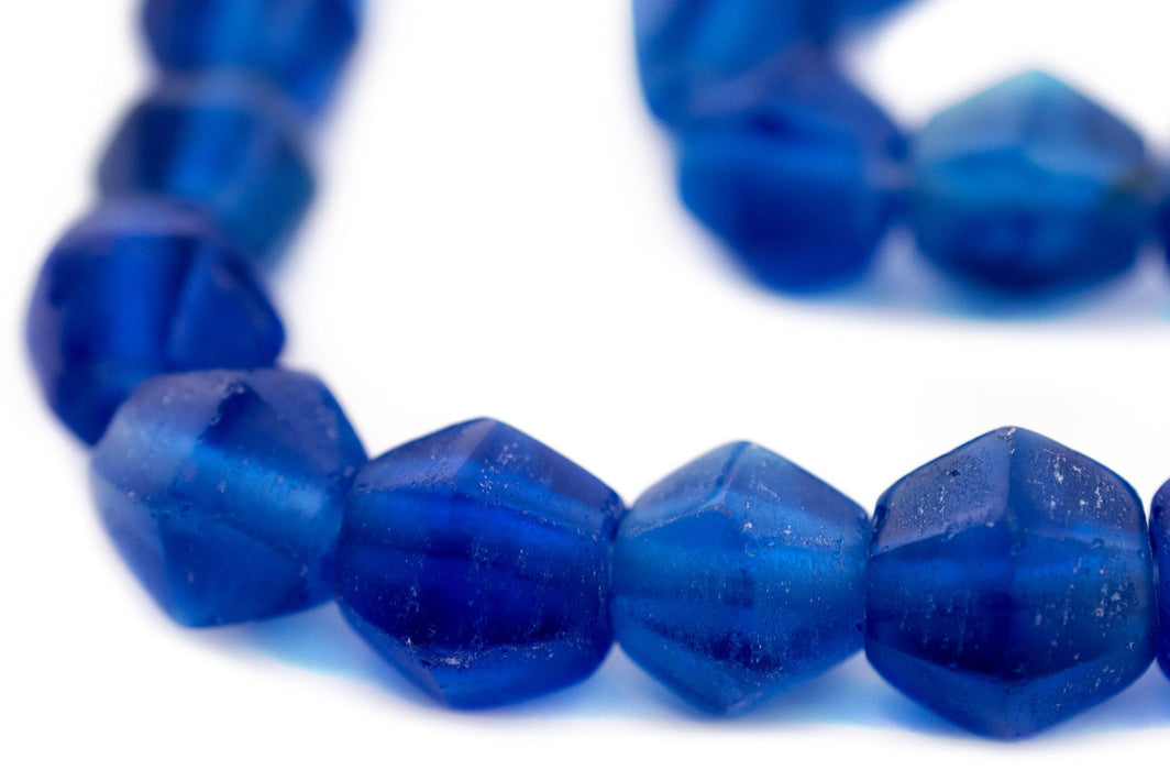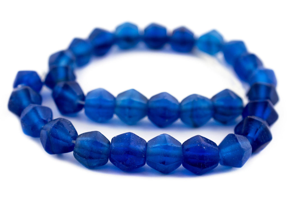 Beautiful strand of recycled glass beads from the island of Java. These unique blue color beads have been fashioned so that they look like pieces of rock candy crystal! Unique translucence lets light pass through. Shade of blue may vary slightly from picture and from bead to bead. Limited Supply!