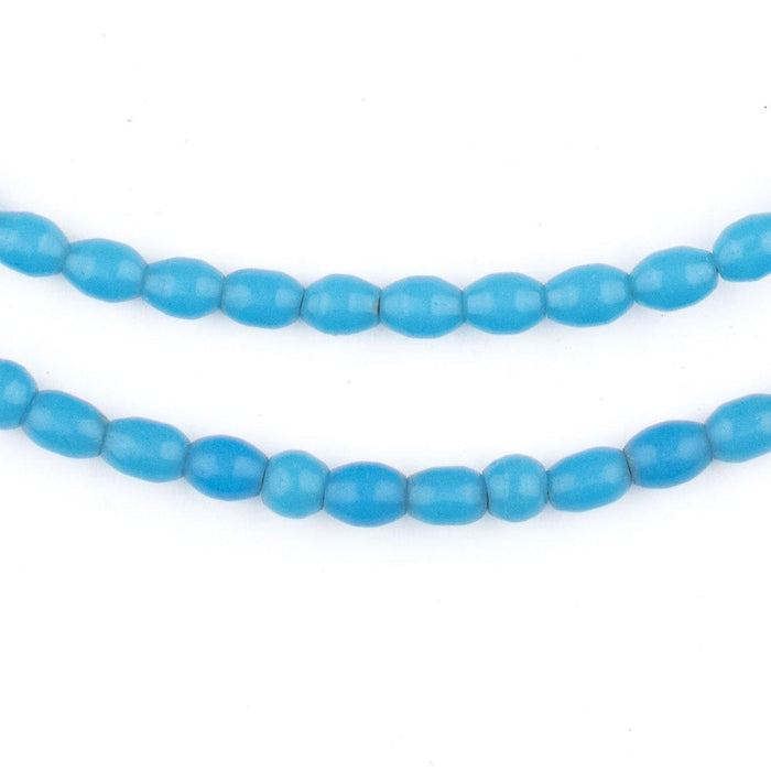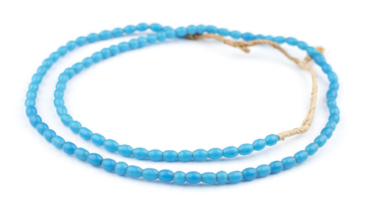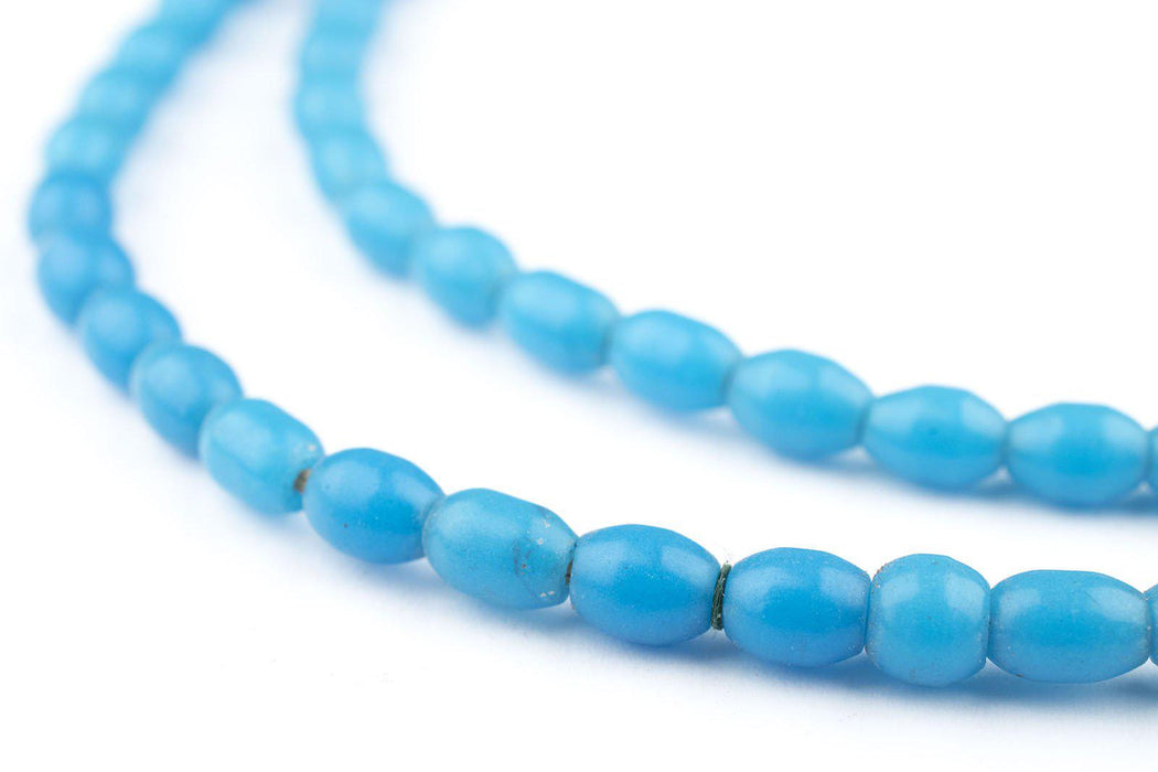 These vintage blue glass beads were originally produced in Czechoslovakia and sent to West Africa in the mid-20th century. Crafted in an oval shape, similar to the grain of rice, they are often referred to as "rice beads." Due to their vintage nature, they are becoming increasingly difficult to find. Each bead measures approximately 6 x 4-5mm with a hole size of 1mm. Strands measure approximately 27". Limited supply available. Get yours today!