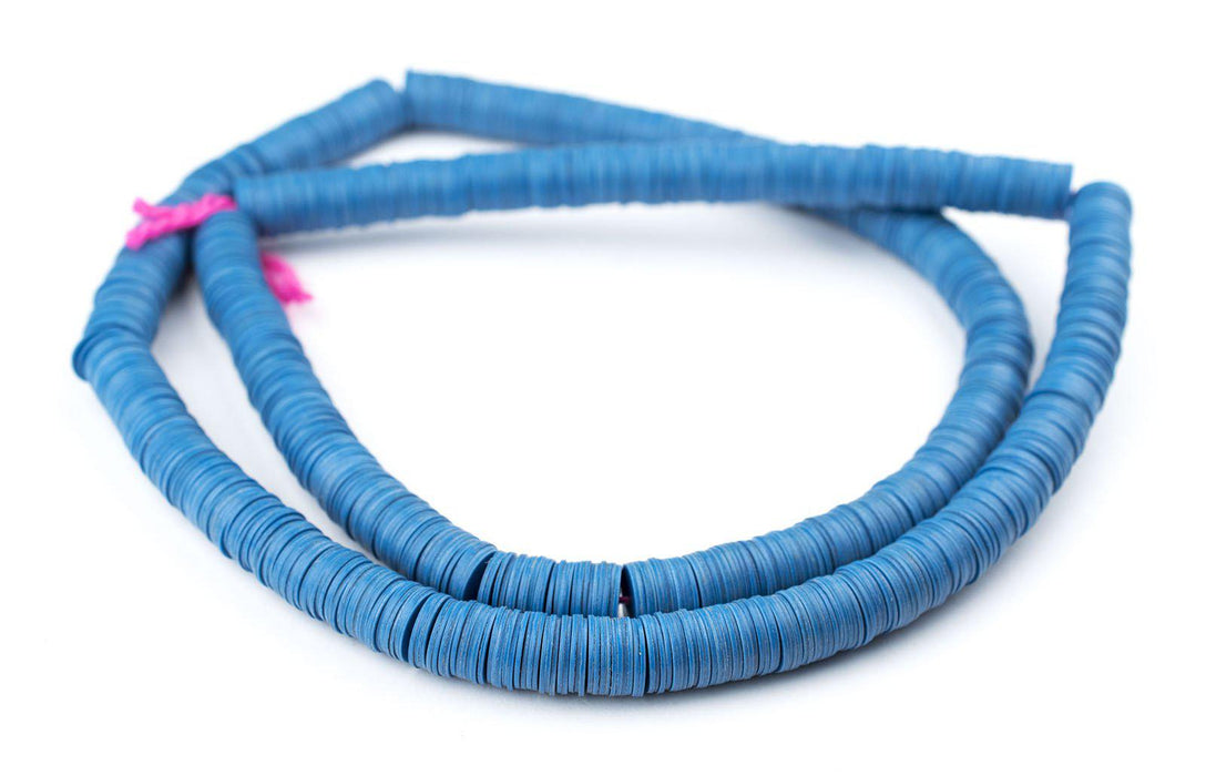 Take a look at this beautiful strand of African vinyl beads in a blue color. Beads such as these are found in Ghana and Nigeria where they are sometimes worn as waist beads. Older versions of vinyl beads were said to be made from recycled phonograph records. This strand measures approximately 36" long with individual beads measuring 1 x 10mm. These beads are light and fun to wear and also versatile for jewelry designs. Each strand is sold individually.