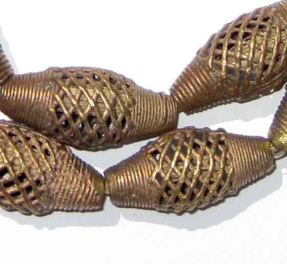 These Brass trade beads are from Ghana, Africa. Each bead is made individually through the "Lost Wax process" technique. The strand is about 26" long and the beads about 25mm in diameter and approx. 37mm long.