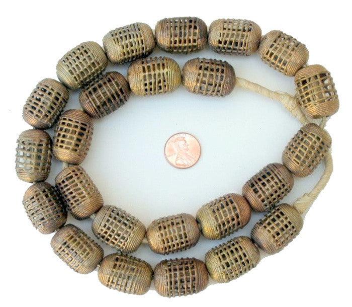 These Brass round cylindrical trade beads are from Ghana, Africa. Each bead is made individually through the "Lost Wax process" technique.