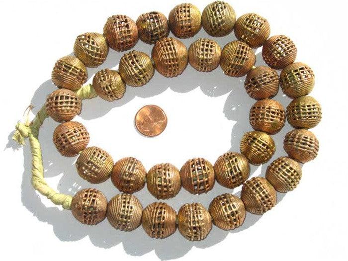 Take a look at these Brass "Globe" trade beads from Africa. Each bead is made individually through the "Lost Wax process" technique. The strand is over 24", with beads measuring 17-22mm in diameter.Each strand may have 1-2 beads that are less than perfect.