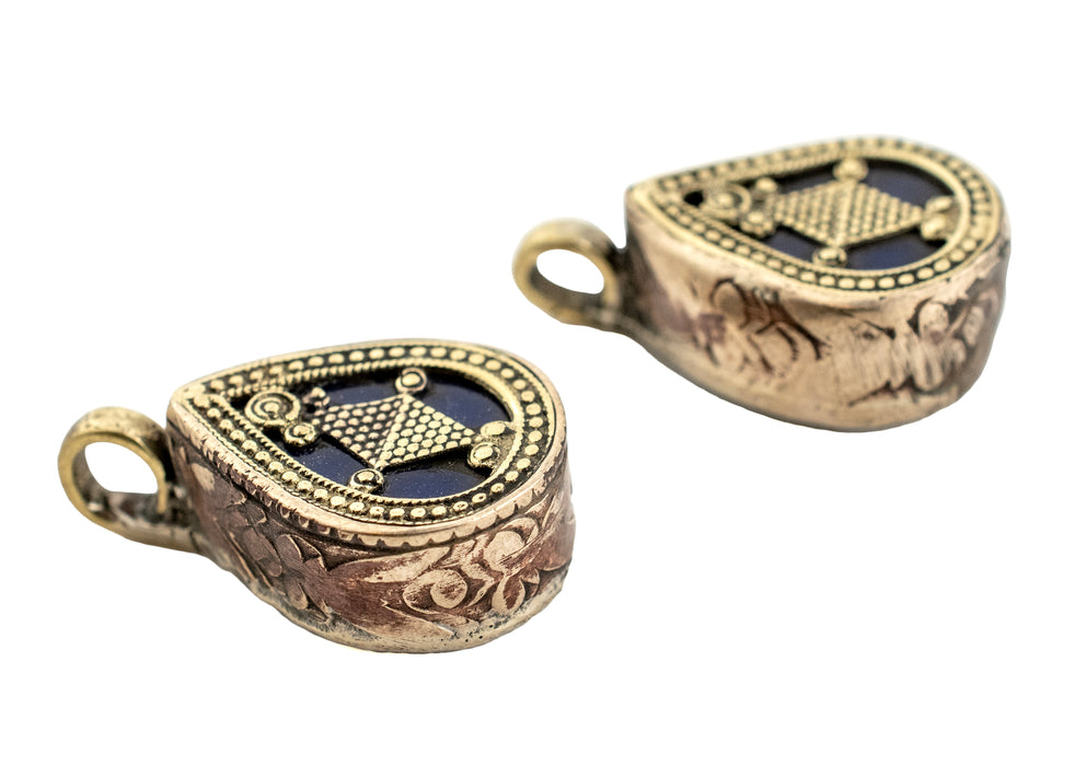 These artisan Teardrop Pendants are a truly unique find. Each pendant features a stunning filigree style diamond-shaped design, with an inlaid glossy dark blue texture set behind the intricate metal detailing. The multicolor tones of the brass and blue creates an earthy and rustic feel that will bring to life to your design projects. Each pendant measures roughly 14-15 x 25mm with a hole size of approximately 3mm. You will receive one pendant per order. Add a few of these striking pendants to your design kit today.