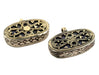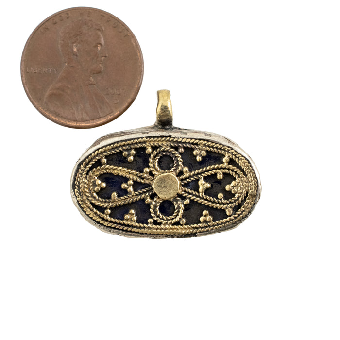 This handcrafted pendant will add a special touch to your unique designs. This decorative piece was crafted by a tribal artisan by encircling a blue glass core with a brass bezel in a floral motif. Each pendant is unique and measures approximately 28-29 x 21-22mm with a bail hole size of 3-4mm. Limited supply!