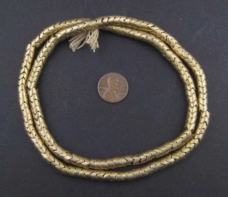 Patterned after vertebrae of the natural snake, these beautiful interlocking brass snake beads are unique to behold. Each strand measures 24" in length with individual beads measure 4-5mm wide by 6.5-7mm in diameter. Each strand includes approximately 160 beads. Feel the solid weight of these beads in your hands, and you'll surely appreciate their fine quality.