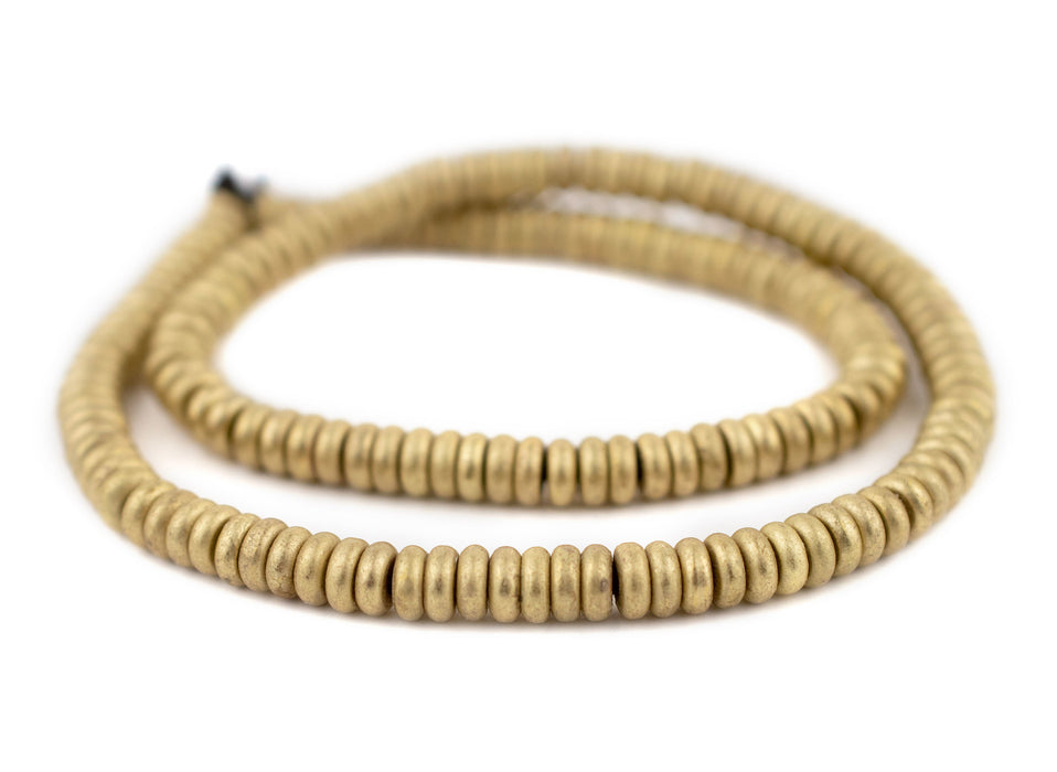 Beautiful strand of high quality, brass beads measuring 16" in length. Individual beads measure 3x6mm in size, with holes measuring approximately 2mm. Each strand includes approximately 160 beads. These highly versatile beads make great spacers, or may be used to accent your unique beaded designs. Feel the solid weight of these beads in your hands, and you'll surely appreciate their fine quality