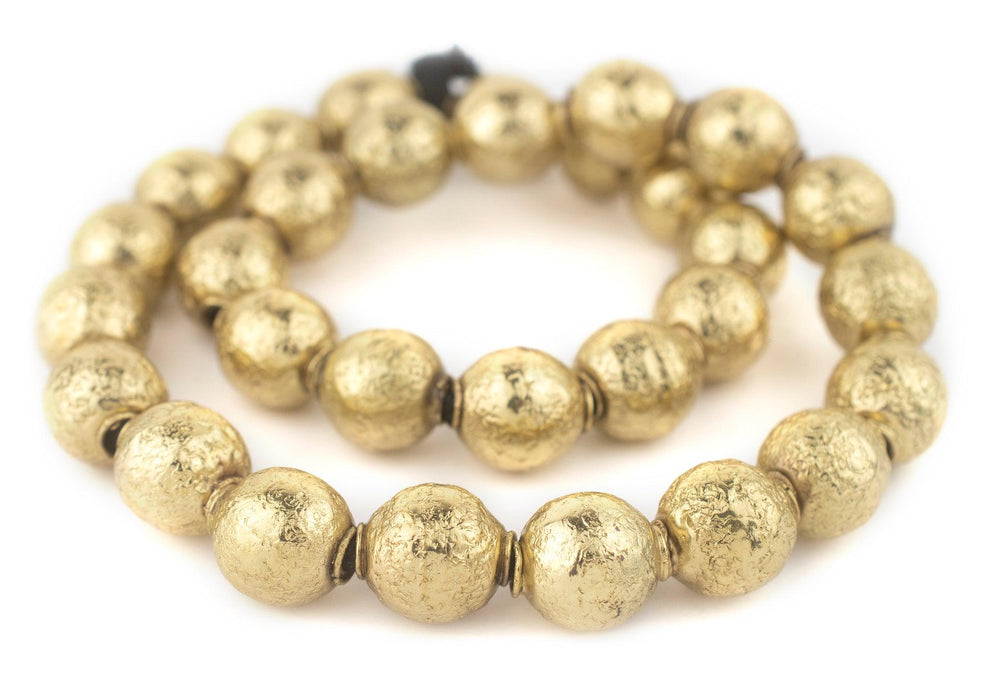 Admire this unusual strand of tribal brass beads. Look carefully to see the high quality of the workmanship, smooth finish, and rustic character. The hollow design of these beads makes them lighter than they look, without compromising quality. Each bead measures approximately 20-21 x 18mm with a hole size of approximately 4-5mm. You will receive a full strand measuring approximately 24", which includes approximately 30 beads.