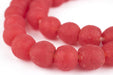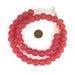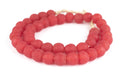 Recycled glass beads are a type of indigenously produced African bead from Ghana West Africa. These beautiful red recycled beads are made using an old method that has been used for centuries. The glass itself is derived from a variety of recycled sources including old beverage and medicine bottles. The procedure for making the beads consists of a number of steps whereby powdered glass is poured into molds of clay and baked in a specialized oven. These beads are produced in large part by the Krobo tribe and through recycling glass are environmentally friendly.