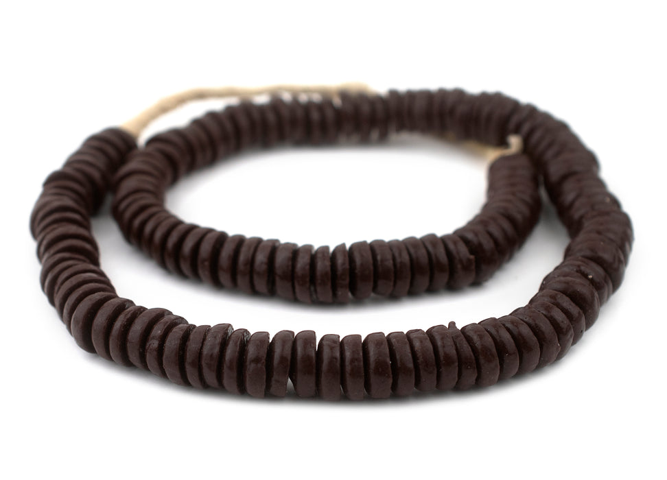 Checkout this beautiful strand of Ashanti glass saucer beads. The process of making these beads is unique to Africa and has been used for over 1000 years. Pulverized glass of various colors is poured into a clay mold, using a cassava stem for the bead's hole. The mold is placed in a furnace and heated until the glass particles congeal without actually melting and the stem burns out. The Ghanaians have been making beads in this manner since the 1600s. Each bead measures approximately 3-4 x 14mm with a hole size of approximately 3mm. You will receive a full strand measuring approximately 28". Available in many colors.