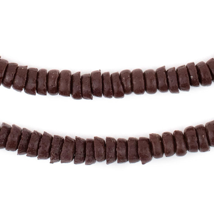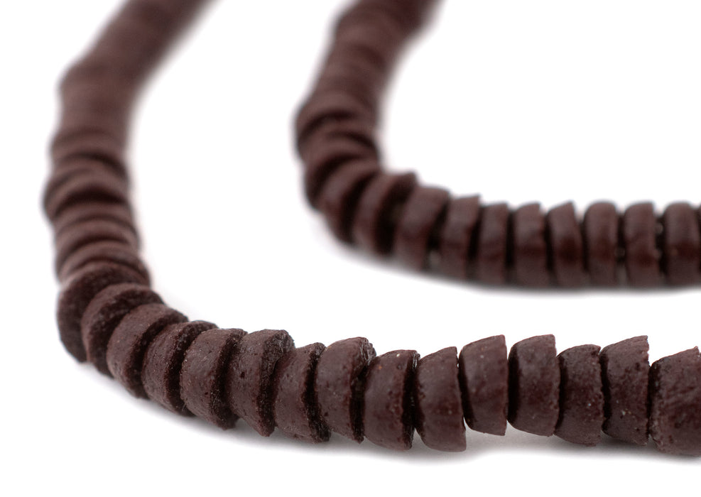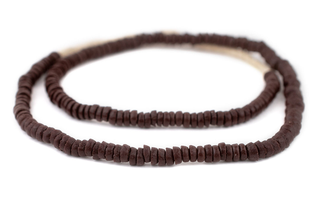 Checkout this beautiful strand of brown color Ghana glass disk beads. The process of making these beads is unique to Africa and has been used for over 1000 years. Pulverized glass of various colors is poured into a clay mold, using a cassava stem for the bead's hole. The mold is placed in a furnace and heated until the glass particles congeal without actually melting and the stem burns out. The Ghanaians have been making beads in this manner since the 1600s. Each bead measures approximately 3 x 7-9mm, with holes measuring approximately 2mm.