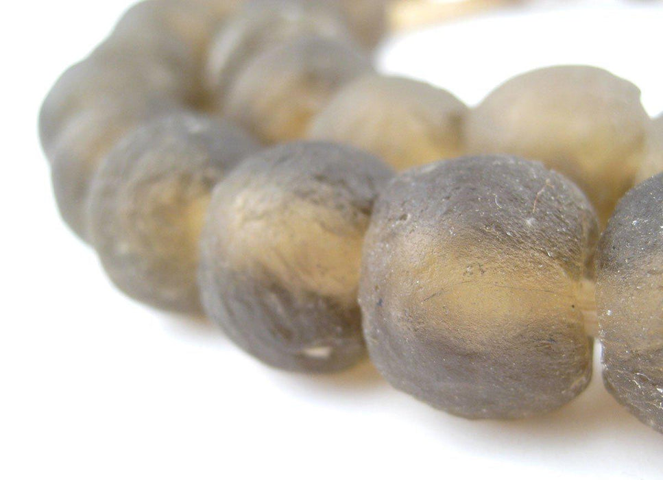 Recycled glass beads are a type of indigenously produced African bead from Ghana West Africa. These beautiful brown color recycled beads are made using an old method that has been used for centuries. The glass itself is derived from a variety of recycled sources including old beverage and medicine bottles. The procedure for making the beads consists of a number of steps whereby powdered glass is poured into molds of clay and baked in a specialized oven. These beads are produced in large part by the Krobo tribe and through recycling glass are environmentally friendly. Shade of brown may vary slightly from photo.