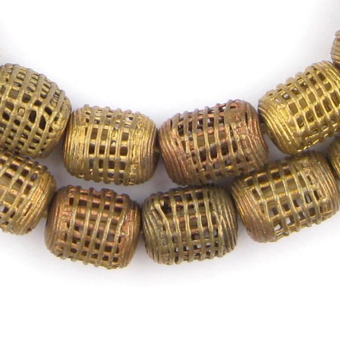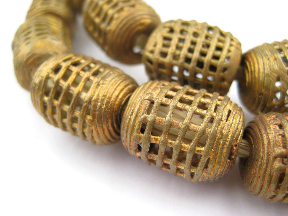 Take a look at these cylinder-shaped Ghana Brass Trade Beads from Africa. Each bead is made individually through the "Lost Wax process" technique. This strand is about 24", with beads measuring approximately 19 x 15mm. Each strand may have 1-2 beads that are less than perfect and may vary slightly from strand pictured.
