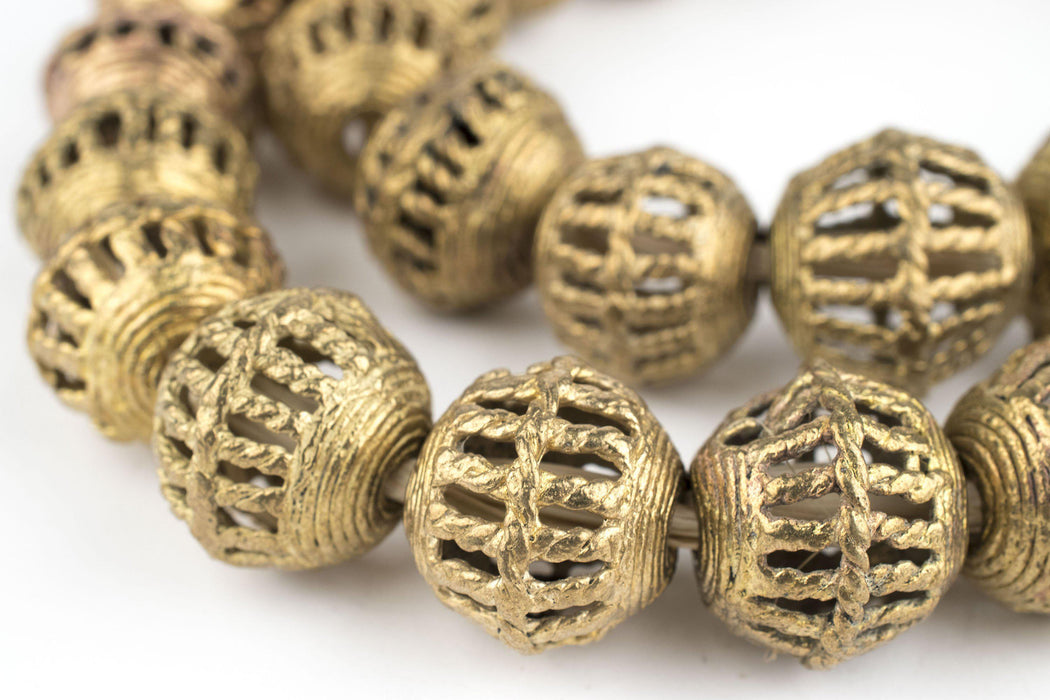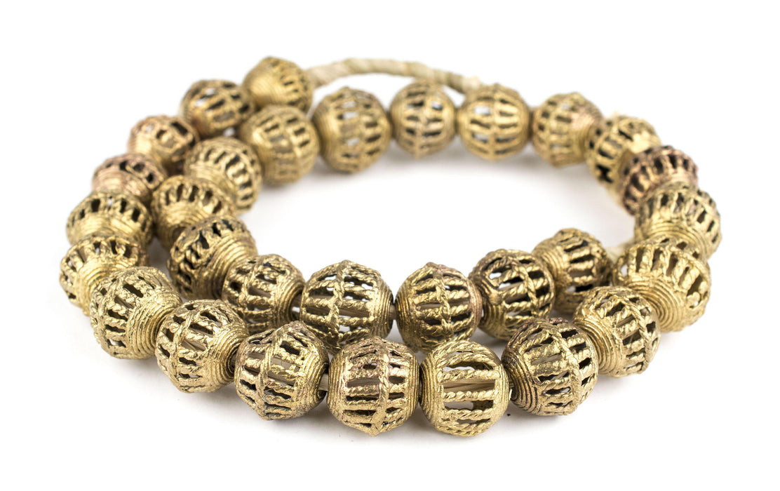 Take a look at these bicone-shaped Ghana Brass Trade Beads from Africa. Each bead is made individually through the "Lost Wax process" technique. This strand is about 28", with beads measuring approximately 15-18 x 18-20mm. Each strand may have 1-2 beads that are less than perfect and may vary slightly from strand pictured.