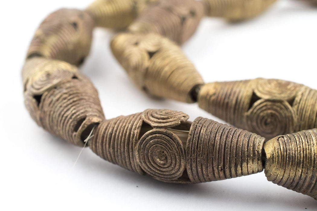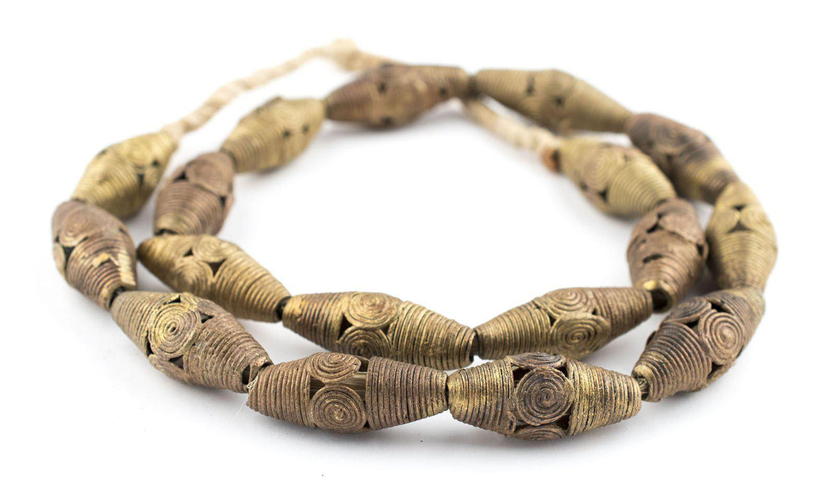 This beautiful strand of African brass beads was made by independent artisans in Ghana. Inspired by traditional Cameroon motifs, these "cameroon-style" brass bicone beads measure approximately 31-35mm in length, and 14-15mm in diameter. Due to the handmade nature of these beads, each strand may contain several beads that are imperfect or damaged. Beautiful boho look for your creative jewelry designs!
