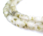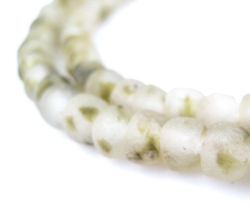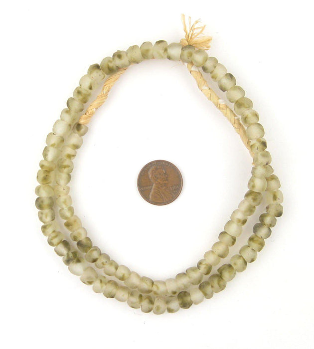 Recycled glass beads are a type of indigenously produced African bead from Ghana West Africa. These beautiful camouflage color recycled beads are made using an old method that has been used for centuries. The glass itself is derived from a variety of recycled sources including old beverage and medicine bottles. The procedure for making the beads consists of a number of steps whereby powdered glass is poured into molds of clay and baked in a specialized oven. These beads are produced in large part by the Krobo tribe and through recycling glass are environmentally friendly.