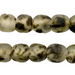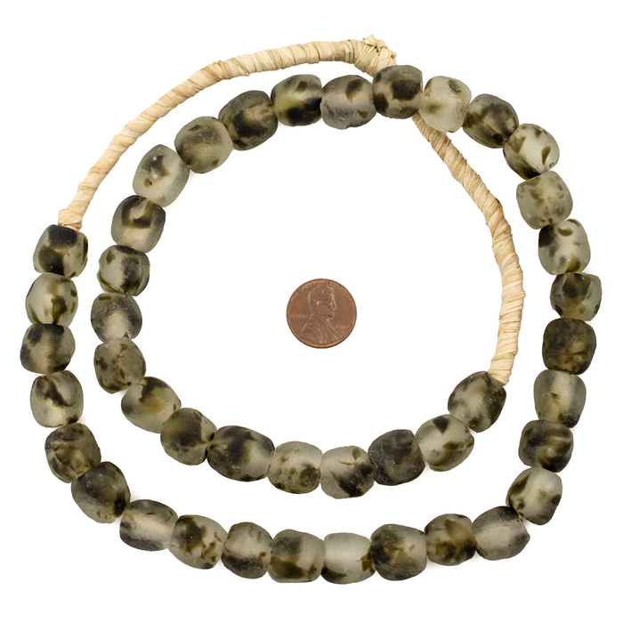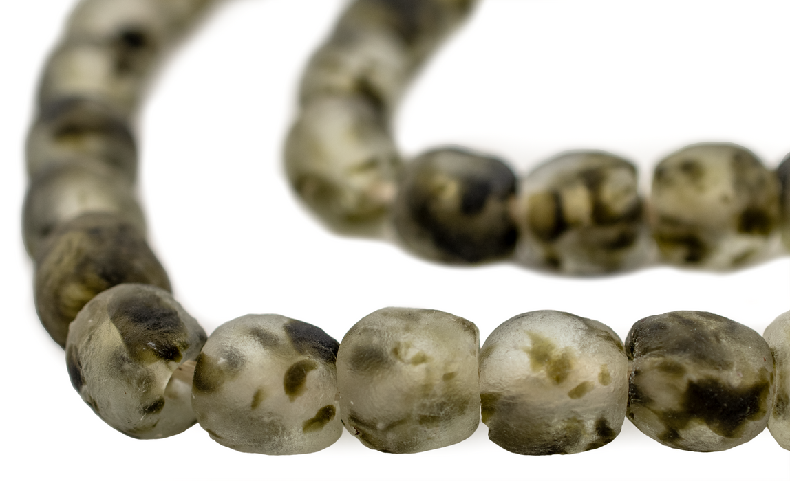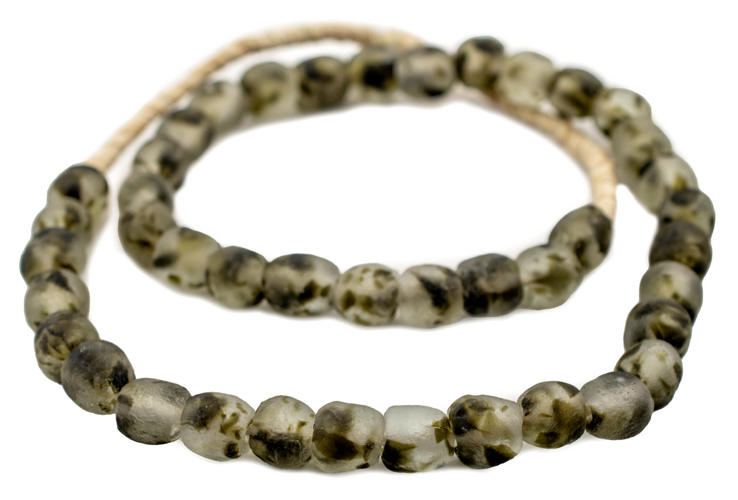 These great beads are made by the Krobo People of Ghana, Africa. Powder glass beads are made by crushing glass to a fine powder and heating it so that the particles fuse together. The glass is then poured into clay molds, with a cassava leaf stem used to make the hole. They are baked in an oven and the glass fuses and the cassava stem burns up. This technique has been used in Africa for centuries. These camouflage color beads show dark green and black color tones. The ratio of dark colors to clear may vary from strand to strand.