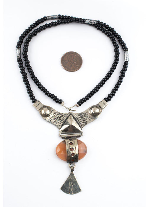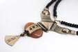 This beautiful pendant was crafted in Niger, West Africa by the Tuareg people. The Tuareg are a nomadic desert tribe that inhabits a broad expanse of territory stretching from the edges of the Saharan desert of Morocco to the north as far as Burkina Faso in the south. Each pendant features traditional designs, measures 23x26mm in size and is fitted with a natural stone. This pendant has been strung with beads and clasp. Wear the necklace 'as-is' or remove pendant and include as a centerpiece in your own personal design!