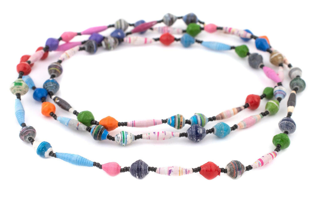 Take a moment to admire the varied shapes and colors of these Paper Beads. These beads are made by using recycled newspapers, magazines, and other paper materials. Examine closely and you will see the workmanship that's been put into each bead by Ugandan artisans. This strand is extra long and may be worn as a simple necklace when doubled around the neck. Each paper bead strand is approximately 63". Each handcrafted bead is about 10-25 x 5-13mm and approximately has a 1mm stringing hole. Each strand is unique and may slightly vary from the photo. Grab a multicolored strand for yourself today!